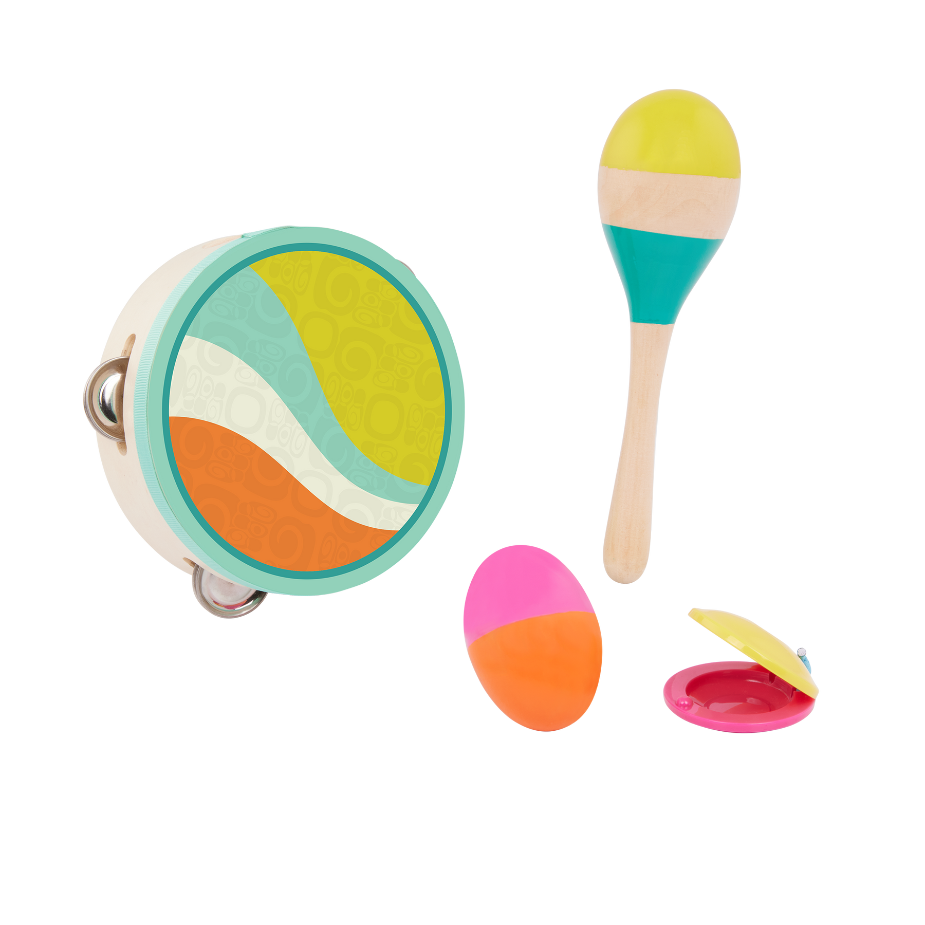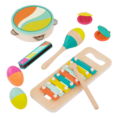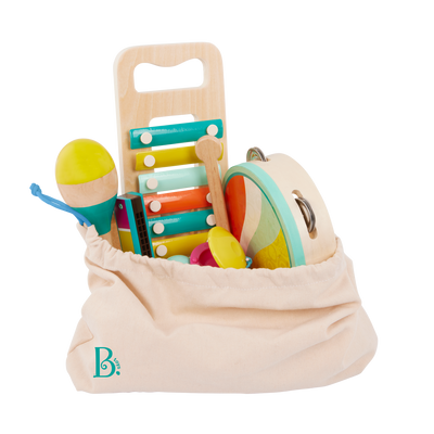 Explorez les sons, les couleurs et les merveilles musicales avec l'ensemble Make a Melody de B. toys ! Cet ensemble d'instruments de musique en bois comprend 9 instruments magnifiques et faciles à jouer pour le plus grand plaisir des petits musiciens. Rassemblez le groupe et distribuez le xylophone coloré, le tambourin, l'harmonica, les castagnettes, les shakers et le maraca, puis voyez où la musique vous emmène ! Cet ensemble de jeu en bois comprend également un sac à cordon pratique pour tout ranger ou pour emmener le groupe sur la route ! Cet ensemble de jeu est non seulement un excellent moyen d'initier les enfants à la musique, mais il favorise également la créativité et l'imagination en jouant de ces instruments. Recommandé pour les enfants de 2 ans et plus.